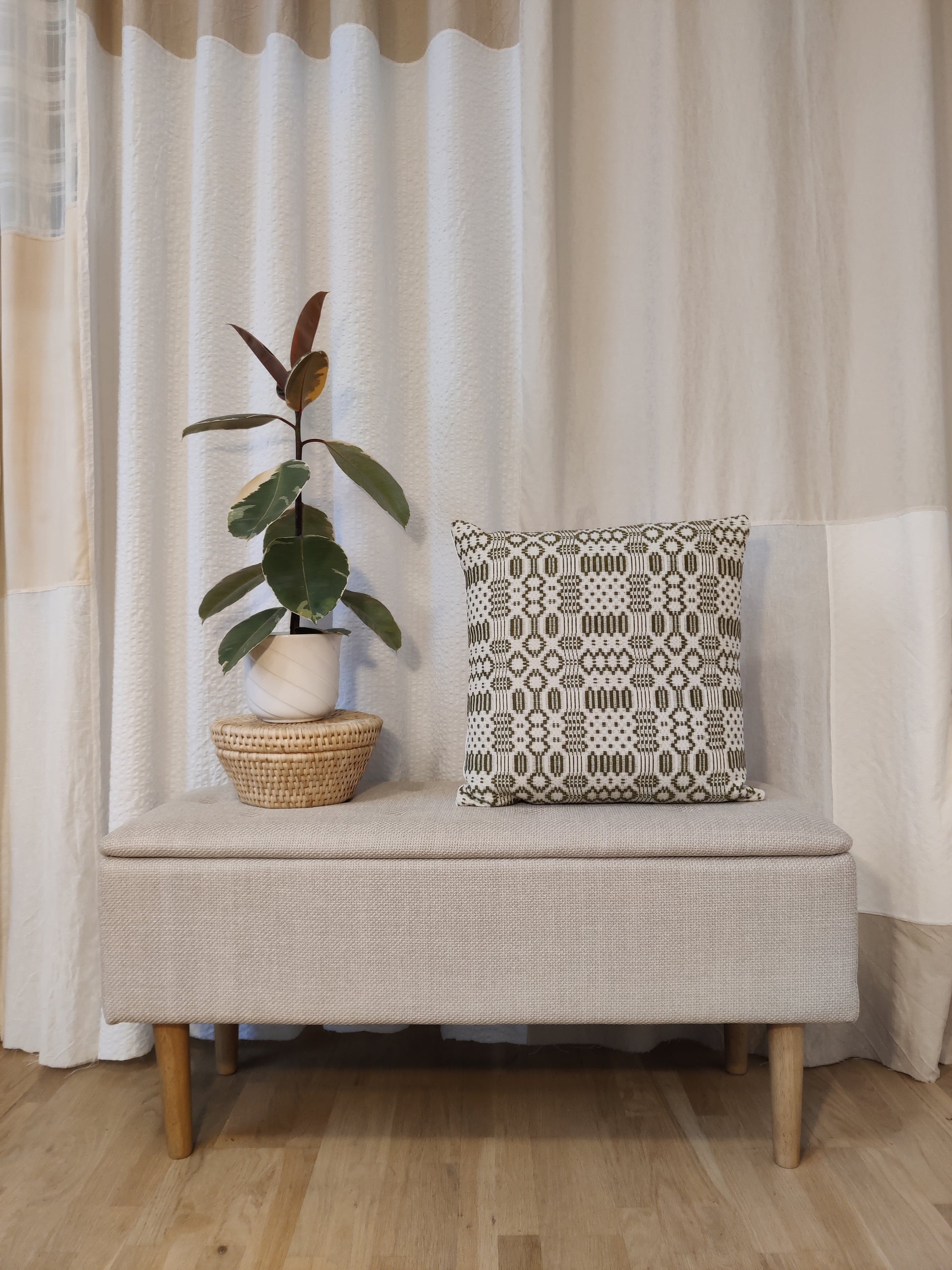 Pudebetræk med et skønt hvidt og grønt mønster i stærk vævet kvalitet. Syet ud af dug og sengetøj fra genbrug. Lukning bag på med 3 perlemors-knapper.