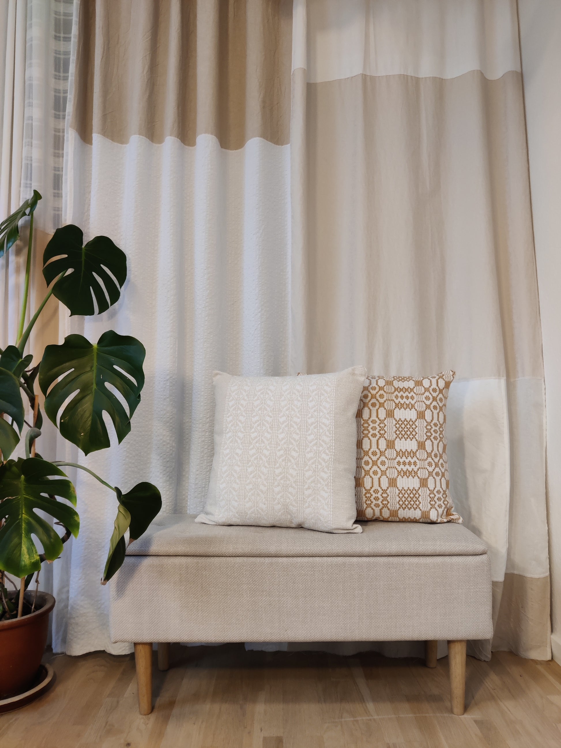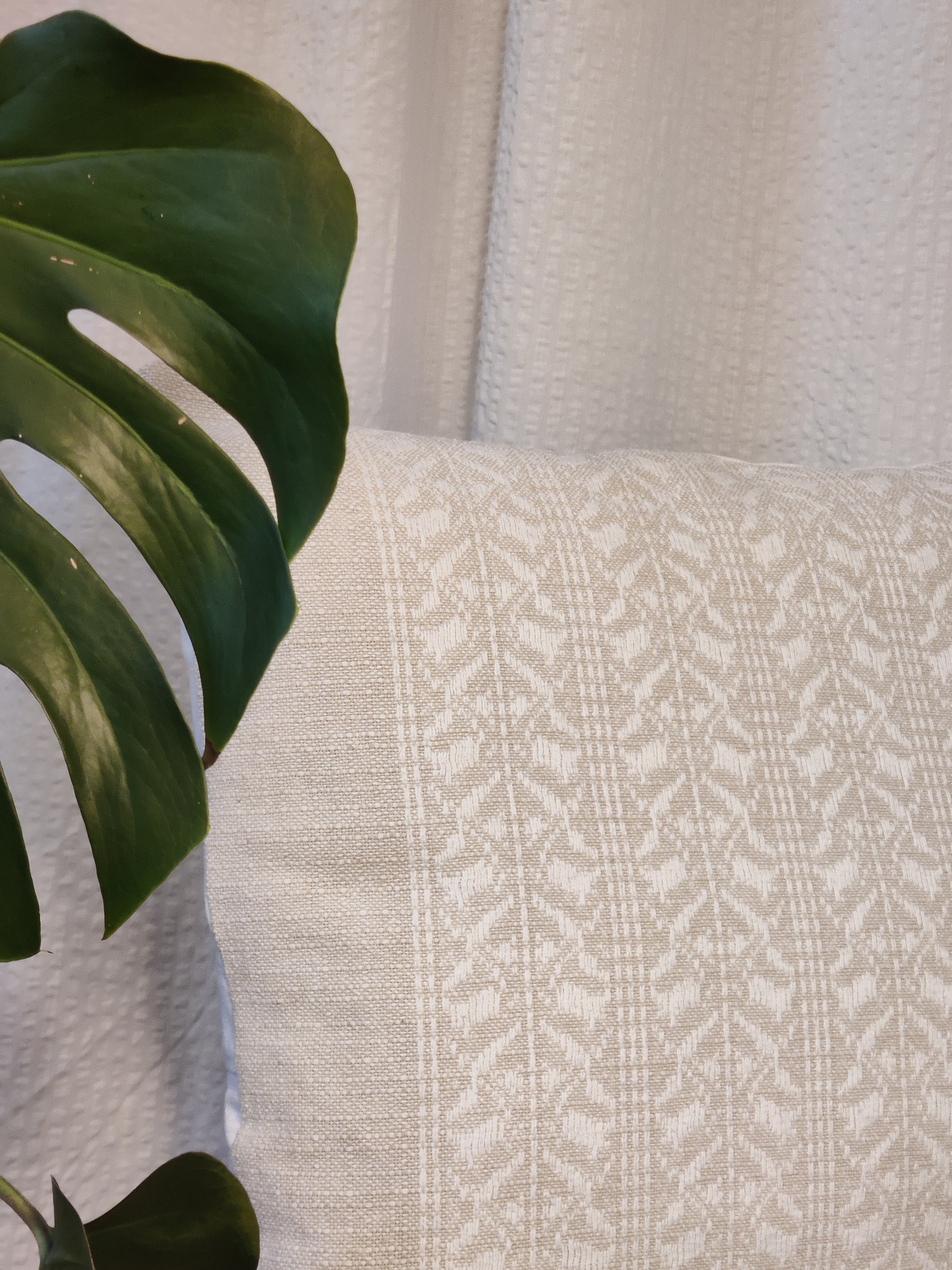 Pudebetræk med et skønt hvidt og beige mønster i stærk vævet kvalitet. Syet ud af dug og sengetøj fra genbrug. Lukning bag på med binde-snore.